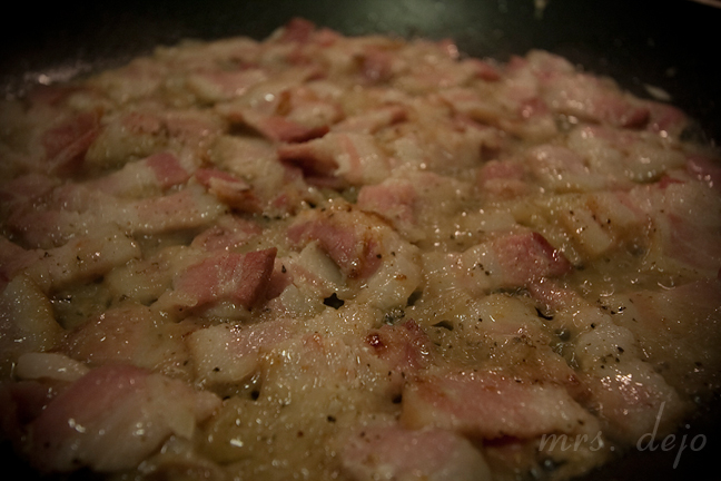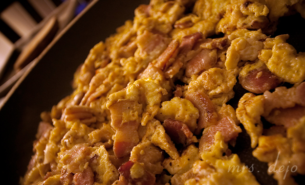 Throw everything but the eggs in a frying pan, cook bacon and onion to your prefurred doneness. I cook it til the liquid cooks almost out.