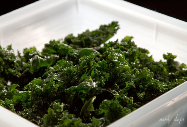 First I remove the stems (and juice them, not that it has anything to do with this) then cut the leaves into smaller pieces and put them in a very large bowl. Pour about two to three tblsp olive oil over the top and keep mixing with your hands until coated. Then add whatever seasoning you like. I used season salt and red pepper.