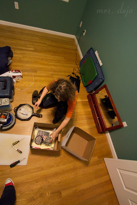 Ahhh don’t you love those last few boxes of randomness… printer paper, hand soap, 17 pens, that pretty thingie that was hanging off the light, one shoe, an assortment of plastic and wire hangers, a night light, the salt and pepper shaker, and a cast iron skillet… (I really didn’t sit and take pictures (maybe a few) while she worked, I know what that last load is like…)