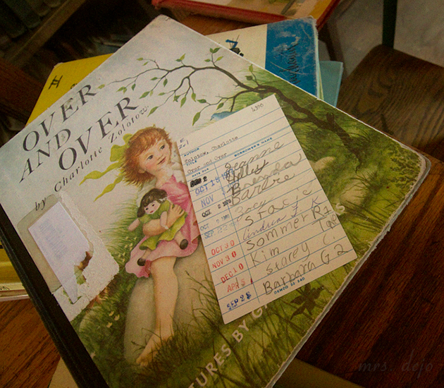 The library donated some old books to be on display in the schoolhouse. I found a book both my sister and I had checked out. It must have been the school library because the name on the middle line is in my mom’s handwriting, and she was the librarian.