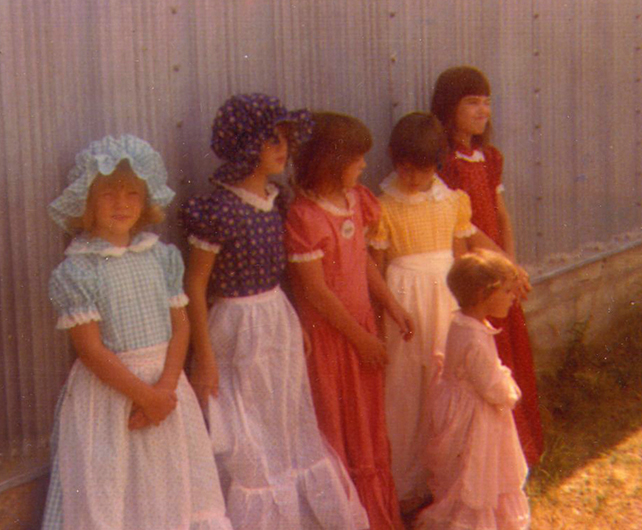 My three sisters: Mary Kay (with me on her lap) Jeanne (beautiful poncho) Anne (leaning in the table). And two cousins: Char (yellow tank) Kathy (standing in the white shirt).